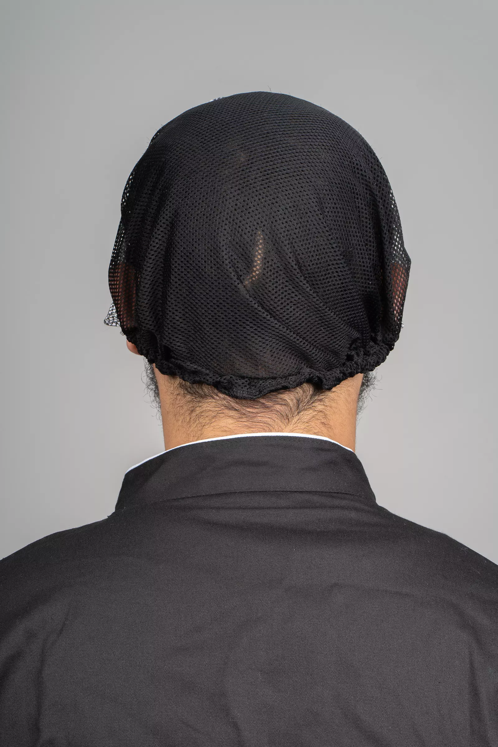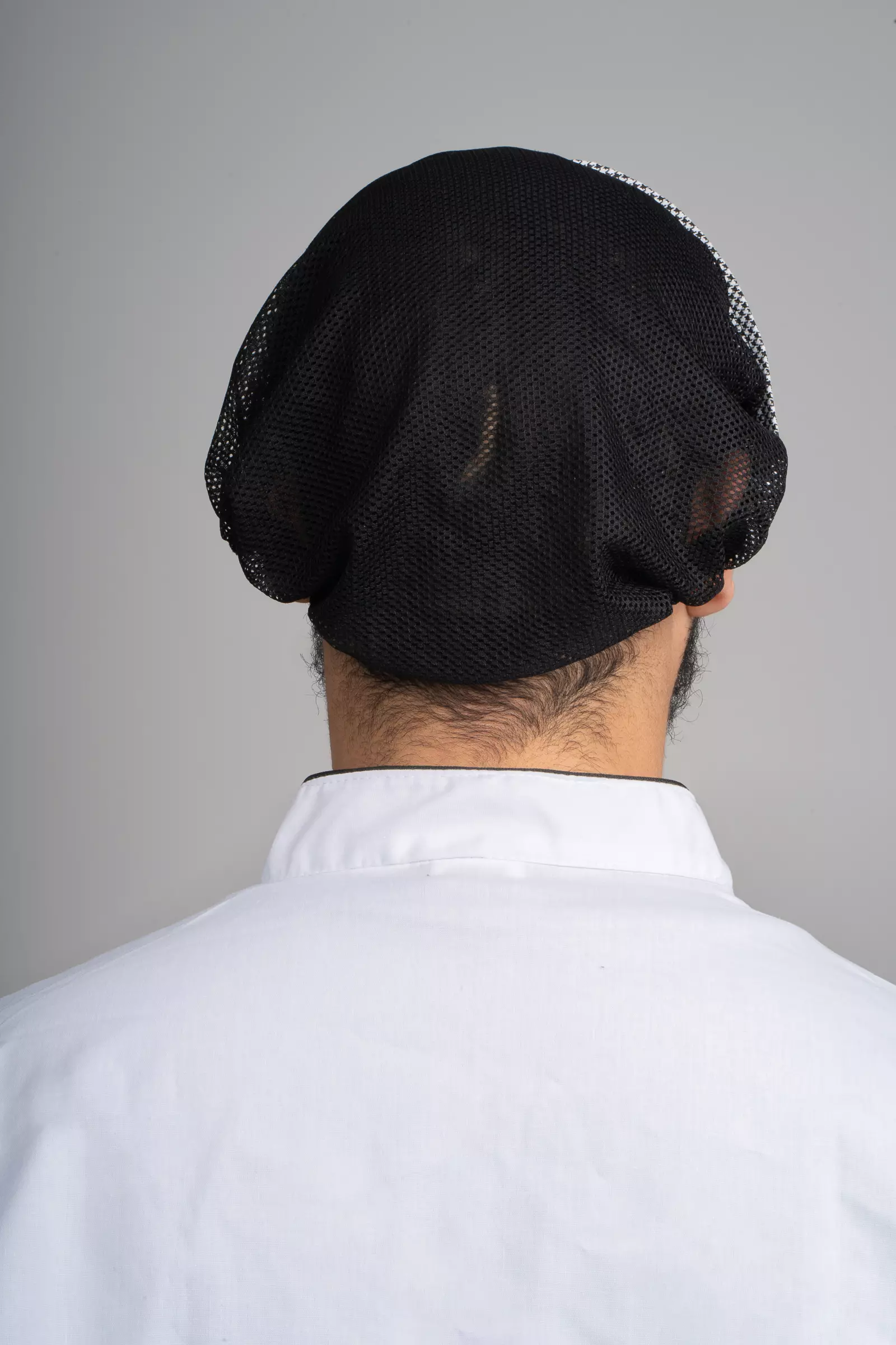 Touca de cozinha feita em tecido na aba e telinha na cabeça com elástico ajustado.