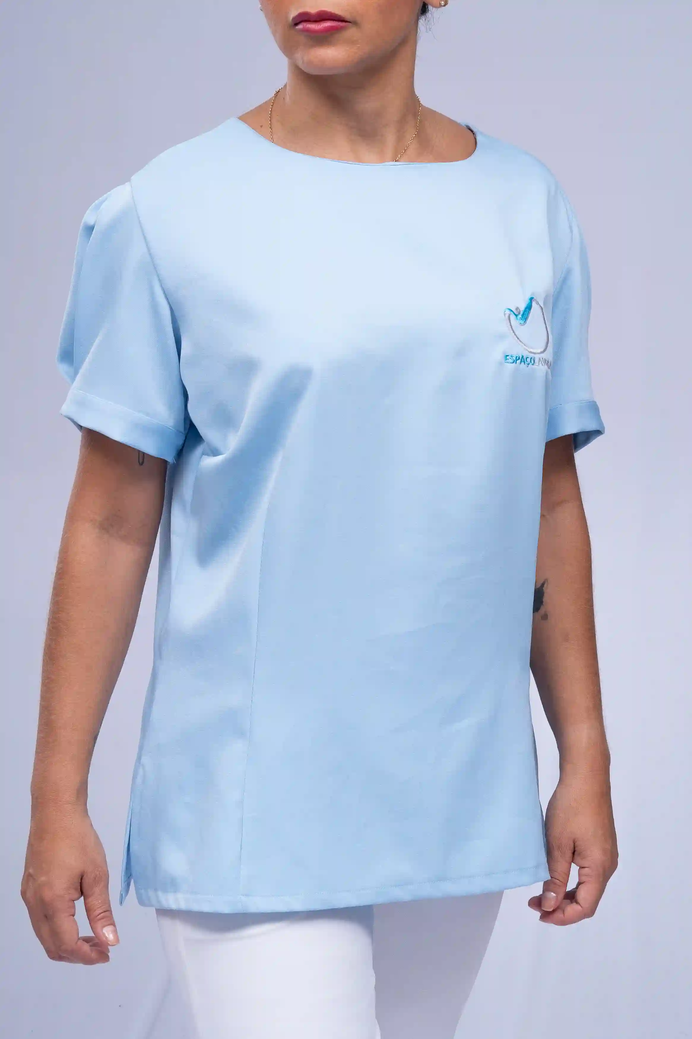 Blusa social em tecido crepe com gola redonda básica. Detalhes bufante na manga. Abertura V na lateral. Sua logomarca inclusa. Faça seu orçamento.