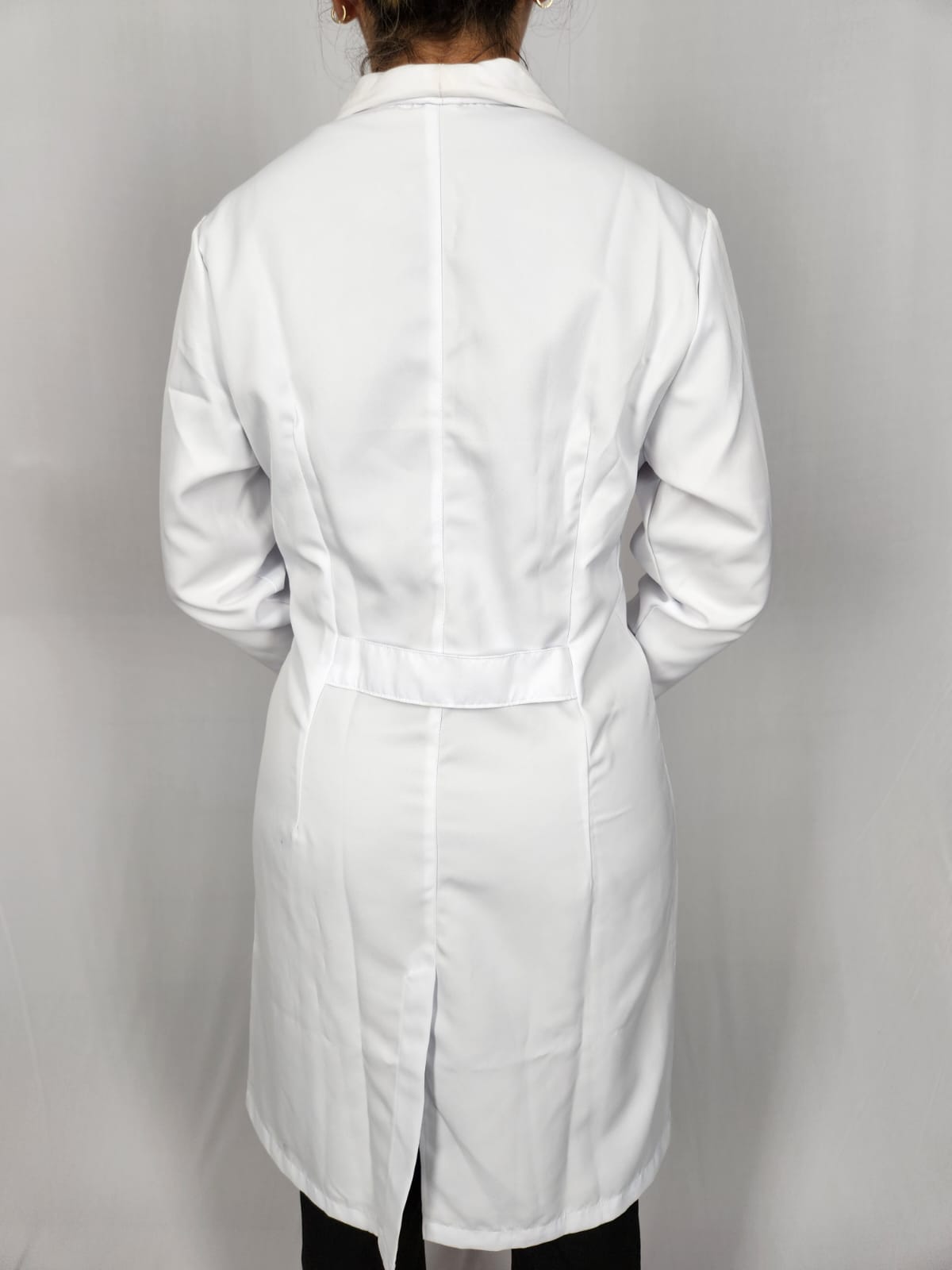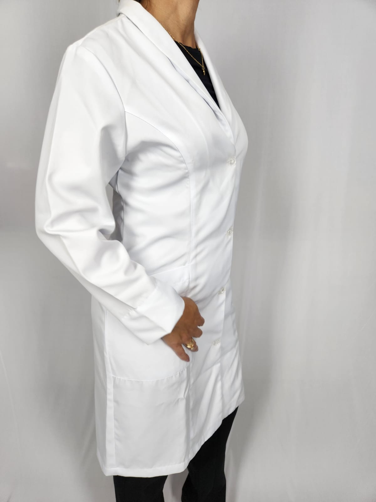 Jaleco fabricado em tecido gabardine 100% poliéster. Manga longa com punho na barra. Abertura frontal em botões. Gola padrão.