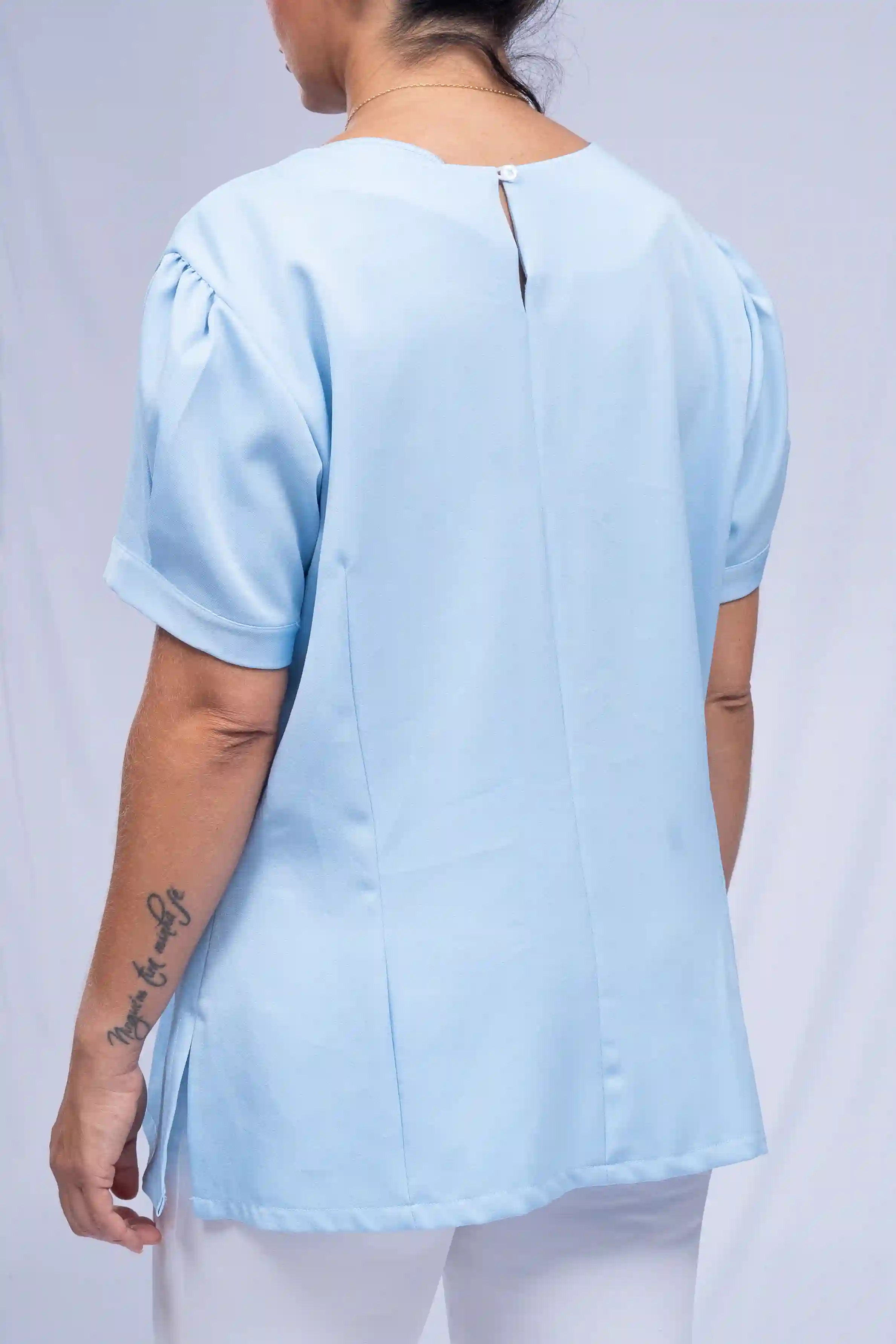 Blusa social em tecido crepe com gola redonda básica. Detalhes bufante na manga. Abertura V na lateral. Sua logomarca inclusa. Faça seu orçamento.
